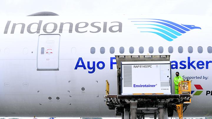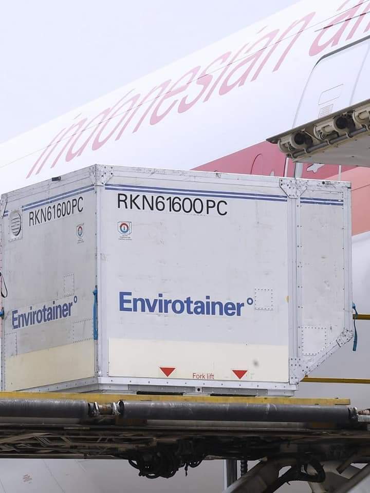Belasan juta dosis vaksin itu dibawa dalam fasilitas pendingin dan diterbangkan dari China ke Indonesia dengan menggunakan pesawat Garuda.