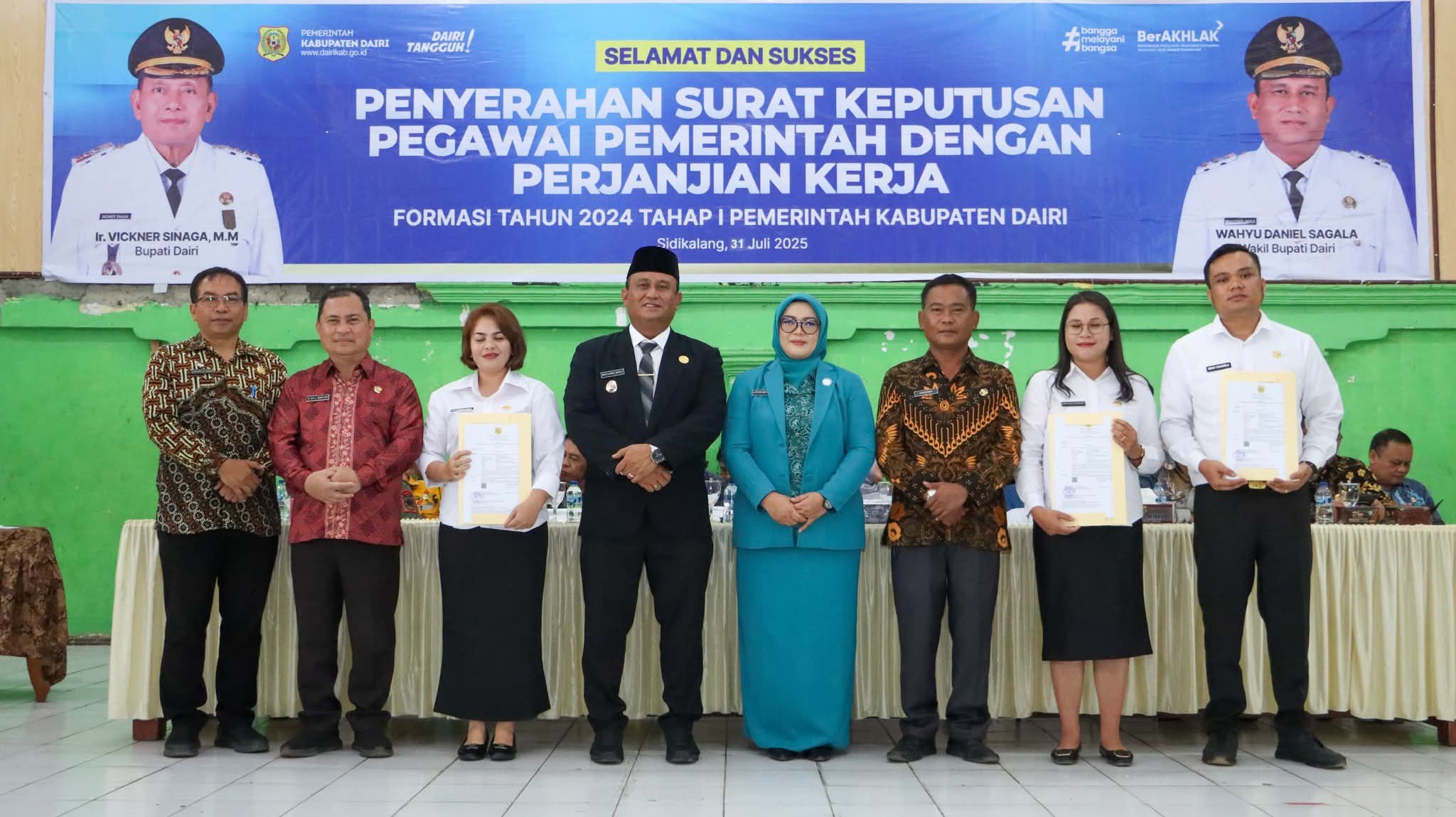 Dairi, Karosatuklik.com – Bupati Dairi, Ir. Vickner Sinaga diwakili Wakil Bupati Dairi, Wahyu Daniel Sagala menyerahkan 644 Surat Keputusan (SK) Pegawai Pemerintah Dengan Perjanjian Kerja (PPPK) formasi Tahun 2024 tahap I Pemerintah Kabupaten Dairi, Kamis (31/7/2025) di GOR Sidikalang