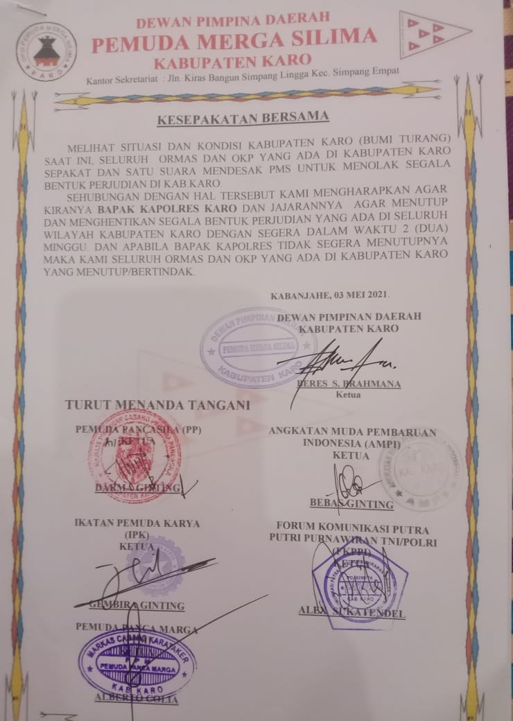 “Surat pernyataan tersebut ditandatangani oleh Ketua OKP dan Ormas masing-masing yakni dari Pemuda Pancasila (PP), Ikatan Pemuda Karya (IPK), AMPI, FKPPI, dan PPM,” tegas Ketua DPD PMS Kabupaten Karo.