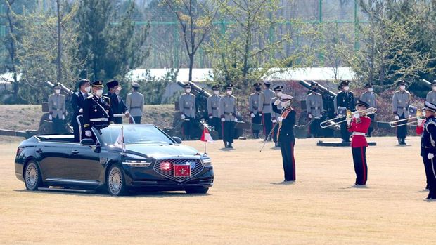 Kunjungan kehormatan (Courtesy Call) Menhan Prabowo kepada Menteri Pertahanan Korea Selatan Suh Wook, disambut dengan upacara militer seperti yang lazim menyambut kepala negara. Tampak kedua pejabat tinggi tersebut mengendarai kendaraan terbuka yang indentik sebagai mobil limosin Genesis G90 buatan Korsel.