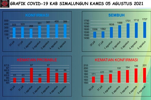 Sebelumnya dikabarkan, kasus terkonfirmasi COVID-19 di kabupaten Simalungun semakin tak terkendali selama sepekan belakangan ini. Angka kasus kematian hingga Kamis (5/8/2021) mencapai 30 orang dan angka terkonfirmasi pada Rabu (4/8/2021) tembus 400 kasus. Namun saat ini menurun menjadi 399 kasus.