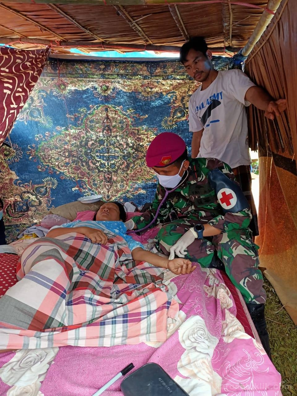 Satuan tugas Kesehatan TNI, selain memberi pelayanan kesehatan di posko kesehatan TNI juga memberikan pelayanan kesehatan secara keliling dengan mendatangi langsung ke tenda pengungsian yang berada di Desa Boteng Utara, Kecamatan Simboro Mamuju, Sulawesi Barat, Senin (18/1/2021).