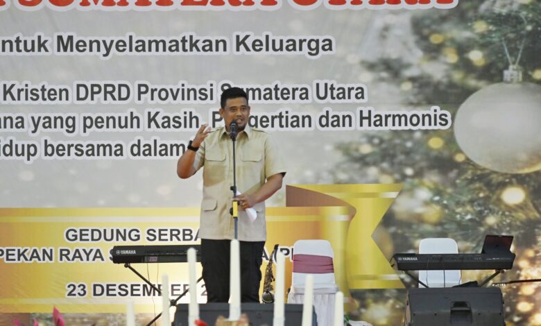 Medan, Karosatuklik.com – Gubernur Sumatera Utara (Sumut) Muhammad Bobby Afif Nasution menghadiri Perayaan Natal Keluarga Besar Dewan Perwakilan Rakyat Daerah (DPRD) Sumut yang digelar di Gedung Serbaguna Pekan Raya Sumatera Utara (PRSU), Jalan Gatot Subroto, Medan, Selasa (23/12/2025).