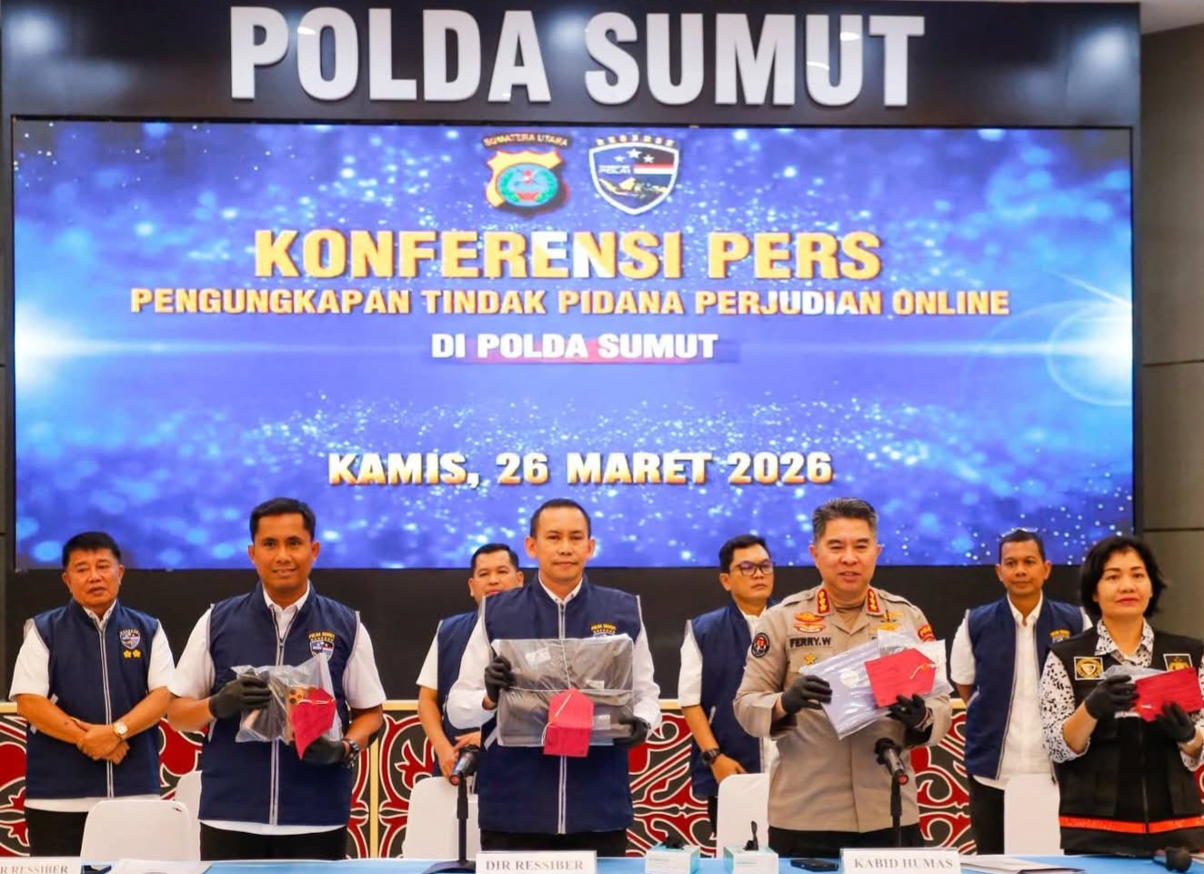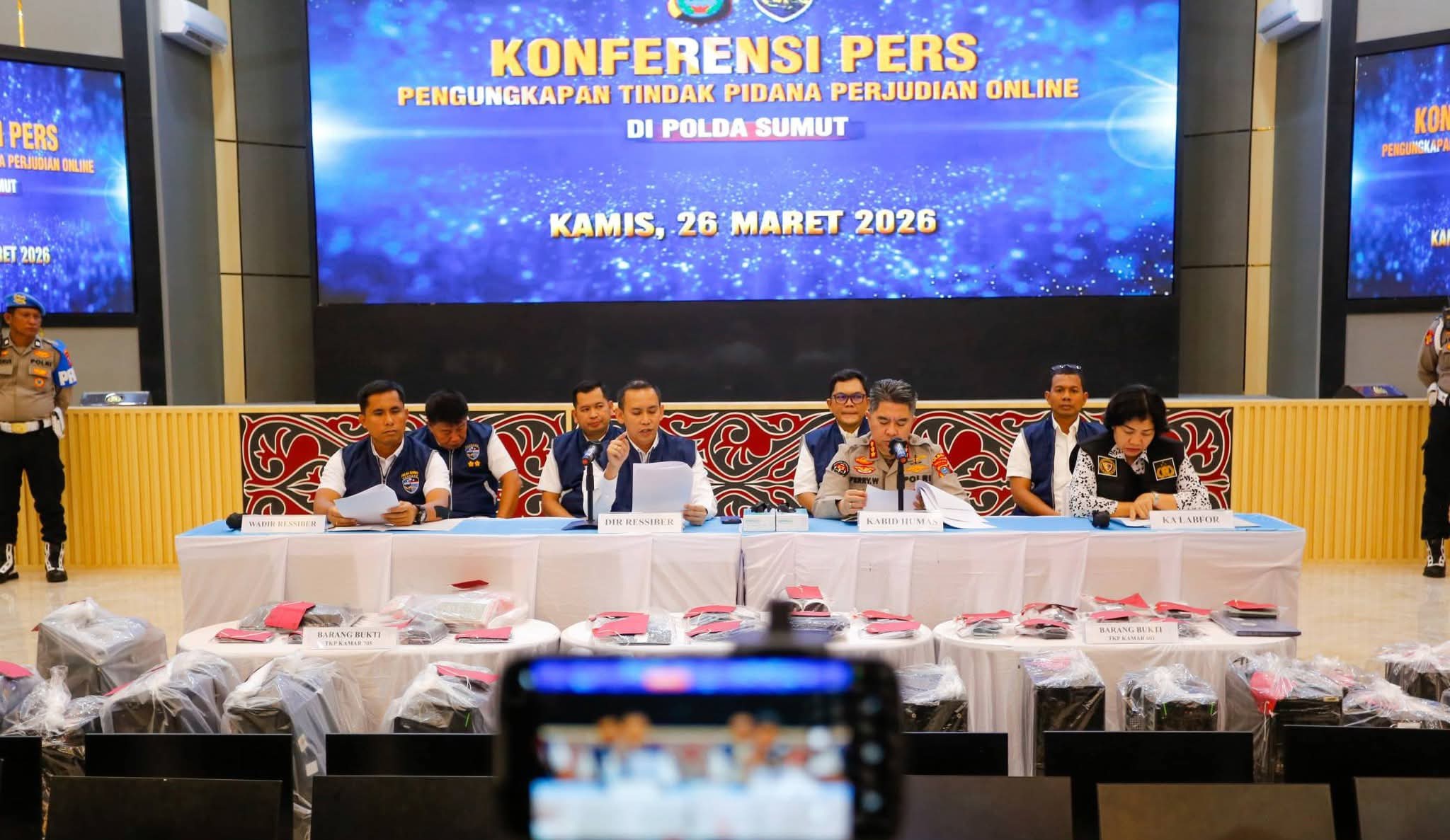 Pengungkapan itu disampaikan oleh Dirresiber Polda Sumut Kombes Pol Dr. Bayu Wicaksono dalam konferensi pers yang dibuka oleh Kabid Humas Polda Sumut Kombes Pol Ferry Walintukan di Aula Tribrata Polda Sumut, Kamis (26/3/2026).