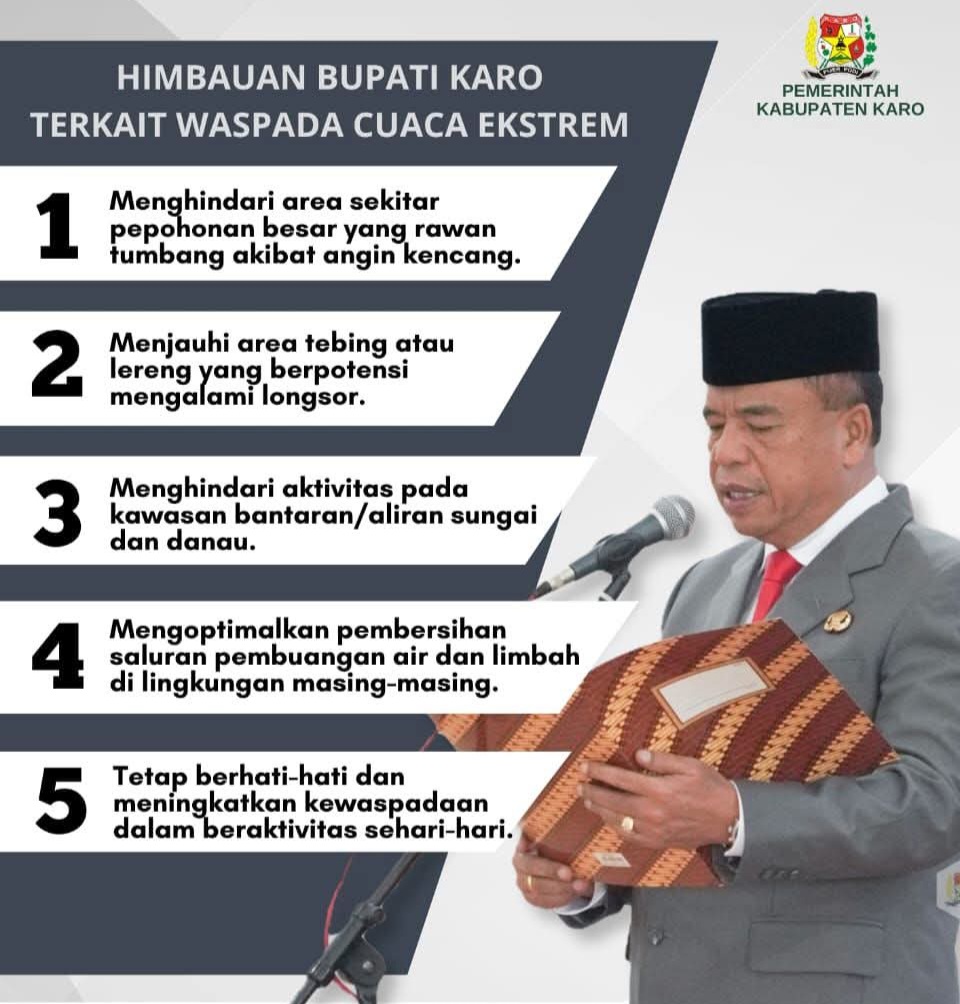 “Untuk itu, saya meminta seluruh masyarakat Kabupaten Karo meningkatkan kewaspadaan, terutama warga yang tinggal di kawasan rawan bencana, seperti daerah aliran sungai, lereng bukit, tebing, serta wilayah yang memiliki riwayat longsor,” pesan Bupati Antonius Ginting dalam imbauannya, Jumat (28/11/2025). (R1)