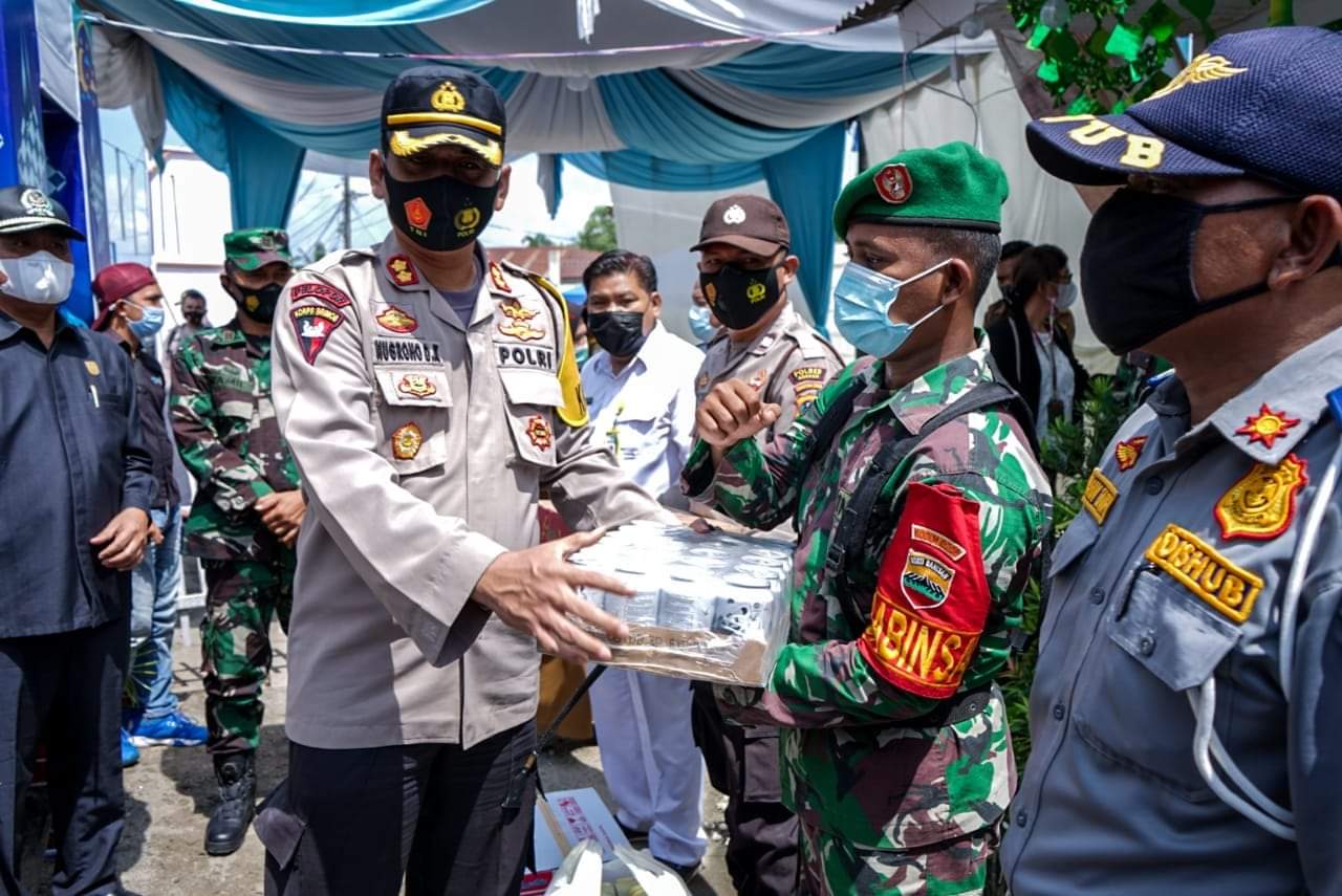Selanjutnya Bupati beserta rombongan memberikan bingkisan berupa makanan dan minuman untuk personel Pos Pam dalam melaksanakan tugas pengamanan Operasi Ketupat Toba 2021.