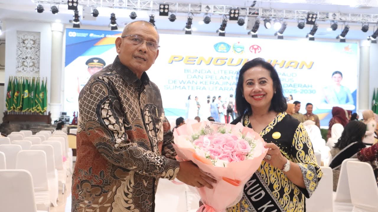 Pengukuhan Bunda Literasi, Bunda PAUD, dan pelantikan pengurus Dekranasda Provsu Masa Bakti 2025-2030 ini digelar, Rabu 13 Agustus 2025, di Aula Raja Inal Siregar.