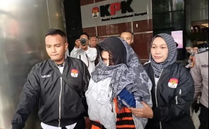 Ia terlihat mengenakan rompi oranye khas tahanan KPK saat digiring petugas.