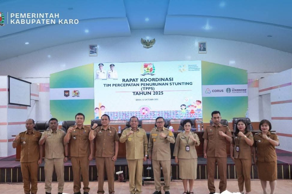 Kabanjahe, Karosatuklik.com – Bupati Karo, Brigjen Pol (Purn) Dr.dr. Antonius Ginting, Sp.OG, M.Kes, didampingi Wakil Bupati Karo, Komando Tarigan, SP, membuka Rapat Koordinasi Tim Percepatan Penurunan Stunting (TPPS) Tahun 2025 yang dilaksanakan di Aula Kantor Bupati, Senin (13/10/2025).
