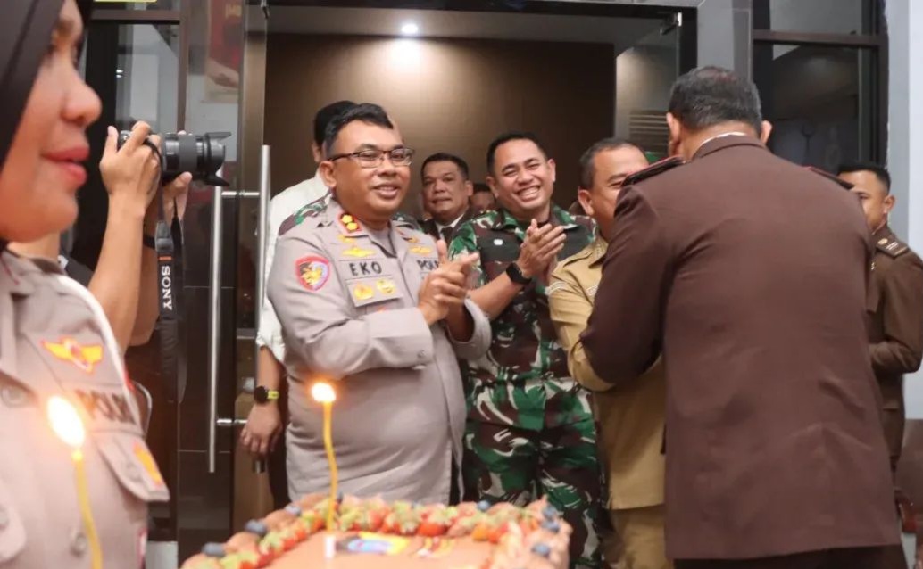 Jajaran Forkopimda membawa kue ulang tahun sebagai wujud kebersamaan dan dukungan kepada institusi Kejaksaan.