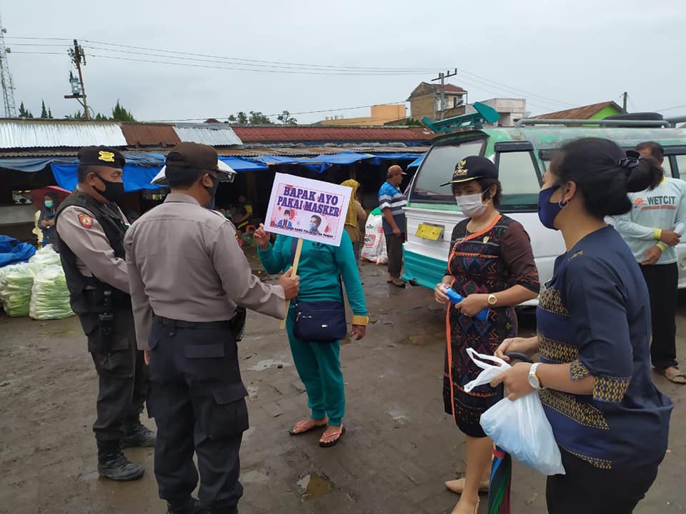 Pantuan di lokasi, saat kampanye “Ayo Memakai Masker” aparat Muspika Kecamatan bersama Kapolsek AKP Ramli Simanjorang selain membagikan masker kepada para pedagang, pembeli dan warga yang melintas, juga mengajak warga tertib memakai masker.