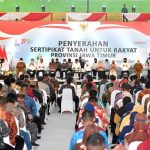 Sidoarjo, Karosatuklik.com – Presiden Joko Widodo didampingi Ibu Iriana Joko Widodo menyerahkan sertifikat tanah untuk rakyat di Gelora Delta, Kabupaten Sidoarjo, pada Senin, 22 Agustus