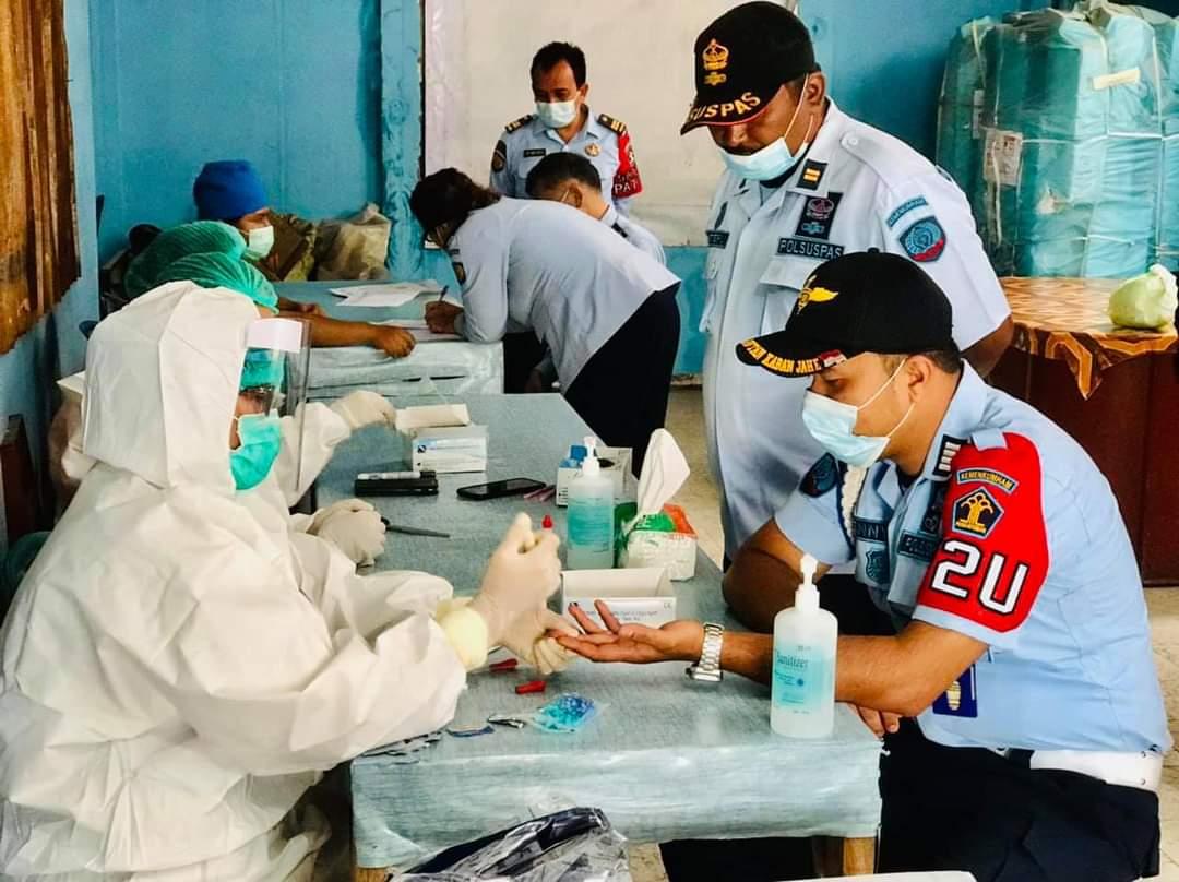 Kabanjahe, Karosatuklik.com – Untuk mengantisipasi merebaknya kasus-kasus baru penyebaran Coronavirus Disease (COVID-19) pada klaster perkantoran, Rumah Tahanan (Rutan) Kelas IIB Kabanjahe menggandeng Dinas Kesehatan Kabupaten Karo melaksanakan Rapid Test Covid-19 bagi Pegawai dan Warga Binaan Rutan Kabanjahe.