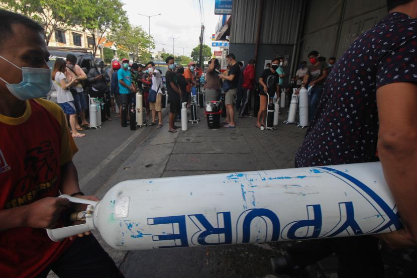 Pria itu mengaku sudah antre untuk mengisi oksigen sejak pagi. Antrean panjang itu terjadi di sebuah perusahaan isi ulang oksigen di Jalan Veteran, Kota Pontianak, Kalimantan Barat.