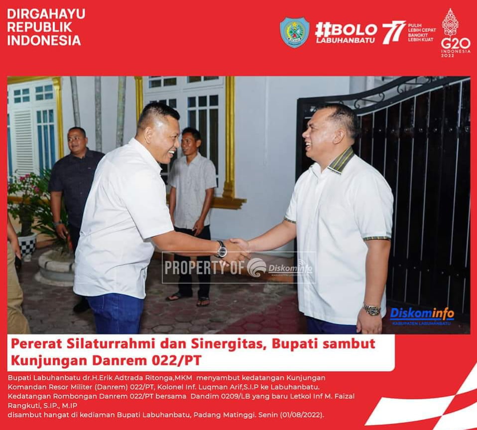 Labuhanbatu, Karosatuklik.com – Bupati Labuhanbatu dr.H.Erik Adtrada Ritonga,MKM menyambut kedatangan Kunjungan Komandan Resor Militer (Danrem) 022/PT, Kolonel Inf. Luqman Arif, S.IP ke Labuhanbatu.