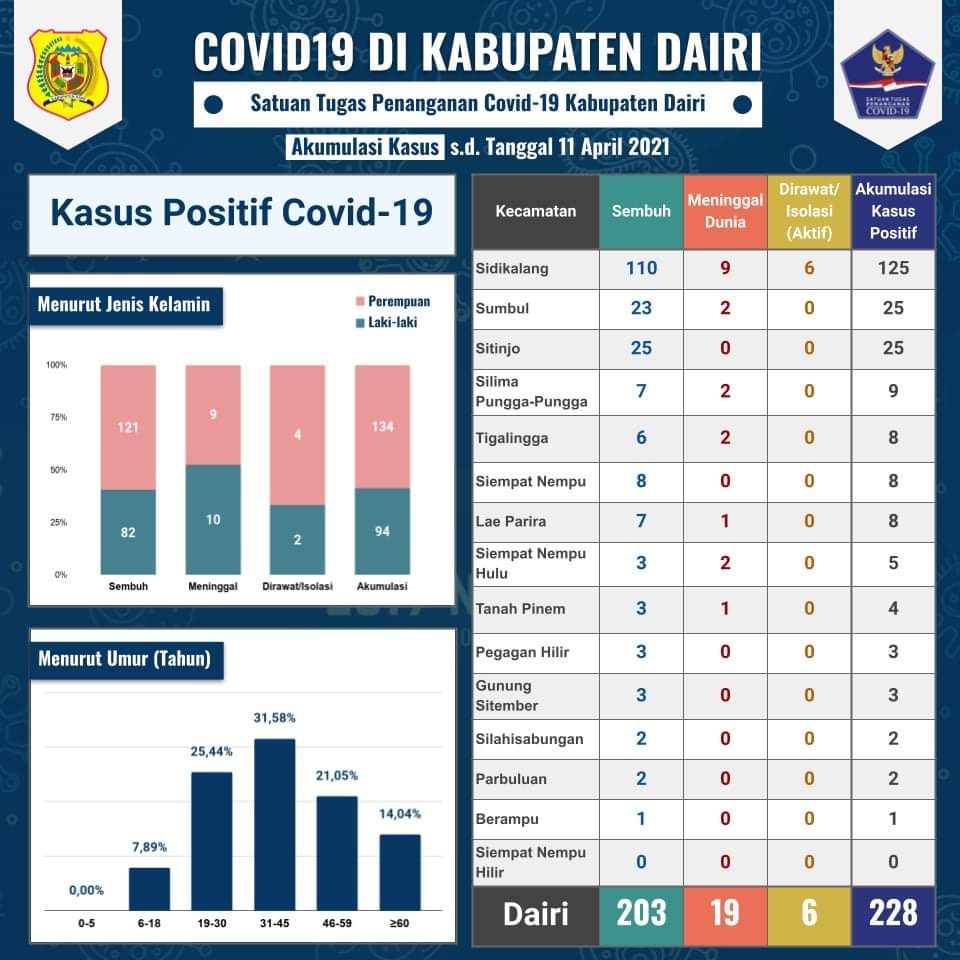 Masih berdasarkan data Akumulasi Kasus sampai tanggal 12 April 2021, Rahmat Syah Munthe menyampaikan bahwa dari data yang dihimpun akumulasi kasus positif dari awal kasus tahun lalu untuk wilayah Kabupaten Dairi sebanyak 230 orang yang tersebar di 14 Kecamatan.
