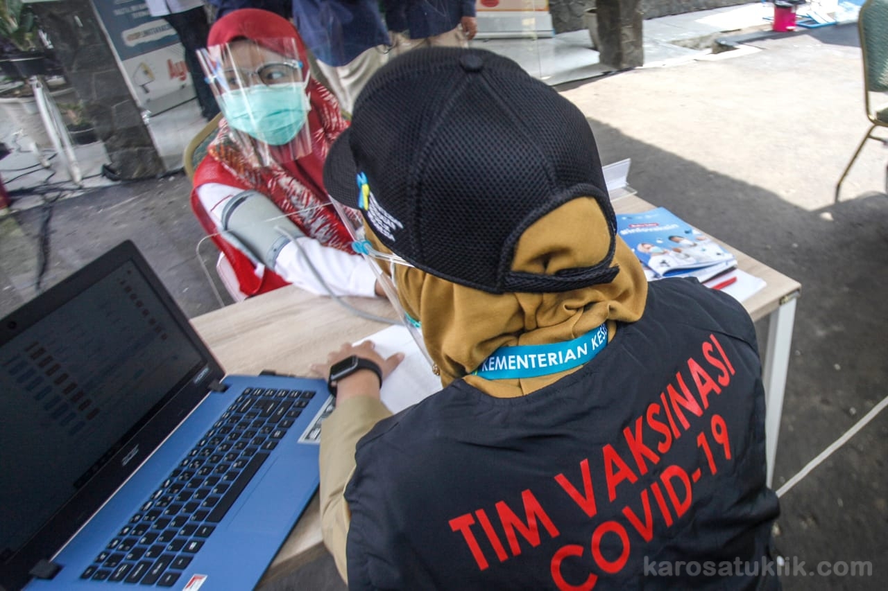 Pemeriksaan meliputi cek suhu tubuh dan tekanan darah. Setelah itu, data skrining tiap sasaran langsung diinput ke aplikasi P-Care Vaksinasi.