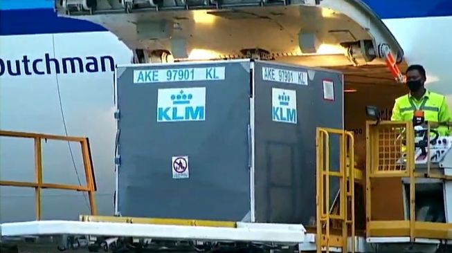 Sedikitnya 1,1 juta dosis vaksin AstraZeneca tiba di Indonesia, Senin (8/3). Vaksin itu tiba sekitar pukul 17.45 WIB di Bandara Udara Soekarno-Hatta, Tangerang. (suara.com)