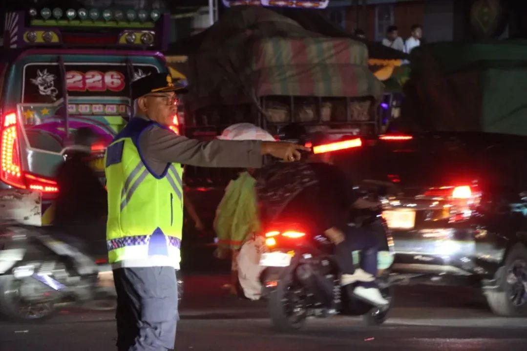 Kapolres Tanah Karo, AKBP Pebriandi Haloho turun langsung ke jalan membantu personel mengatur arus kendaraan, Senin (23/3/2026) pukul 21.00 WIB.
