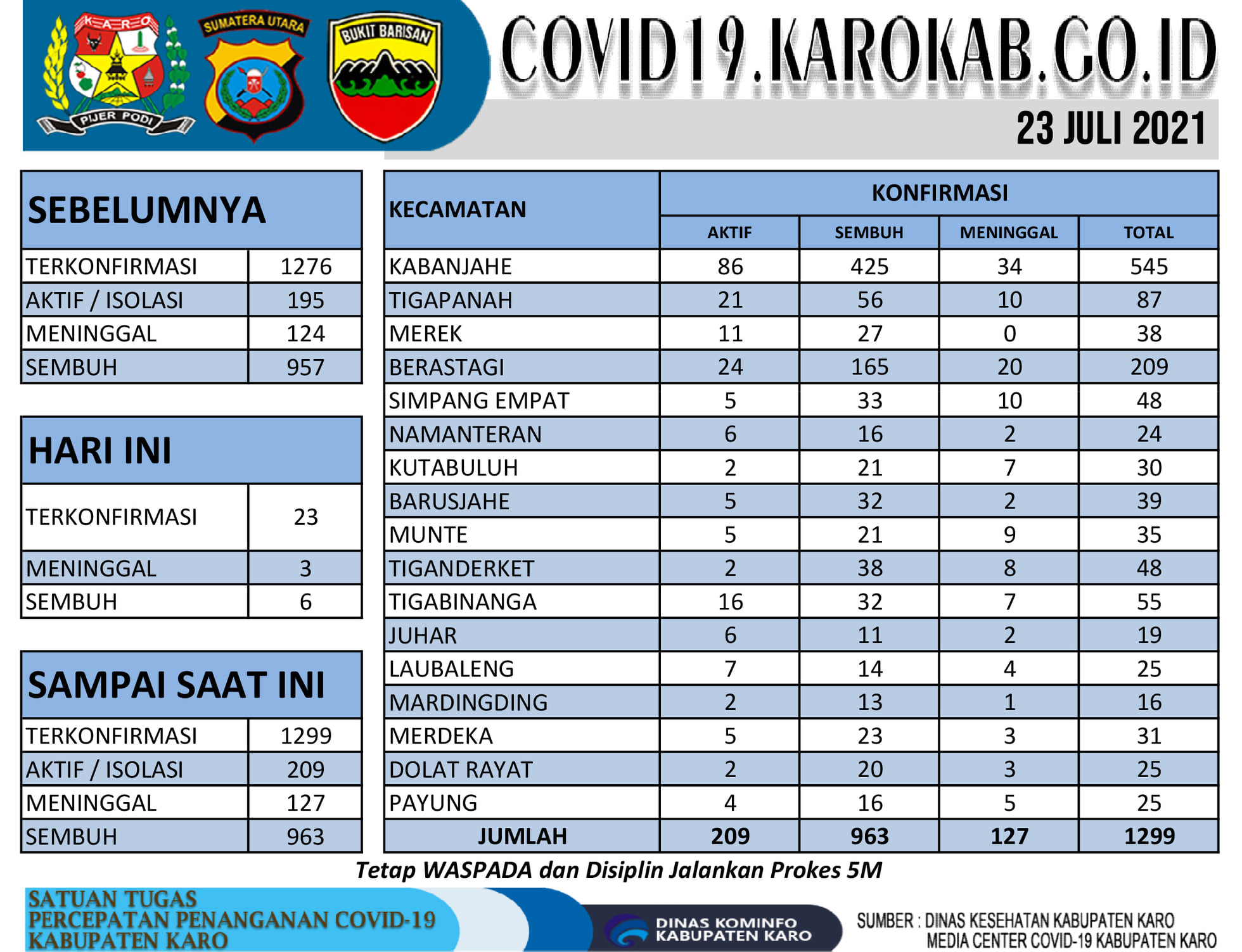 Sebelumnya Karosatuklik.com mengabarkan, kasus kumulatif terbaru Covid-19 Dinas Kesehatan Kabupaten Karo yang dikeluarkan Dinas Kominfo Kabupaten Karo, Jumat 23 Juli 2021: Positif 1299, Sembuh 963, Meninggal 127, isolasi (aktif) 209.