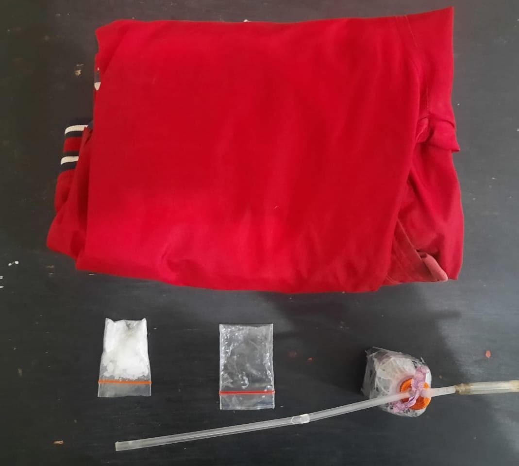 Dari serangkaian penggeledahan yang dilakukan polisi terhadap badan, pakaian dan di sekitar tempat penangkapan kedua tersangka, petugas menemukan barang bukti berupa satu buah bong yang terbuat dari botol kaca bertuliskan cointerau yang masih terpasang pipet plastik, dan satu kaca pirex yang masih terdapat sabu yang setelah ditimbang dengan berat brutto 1,64 gram, ditemukan di atas lantai di bawah sebuah meja.