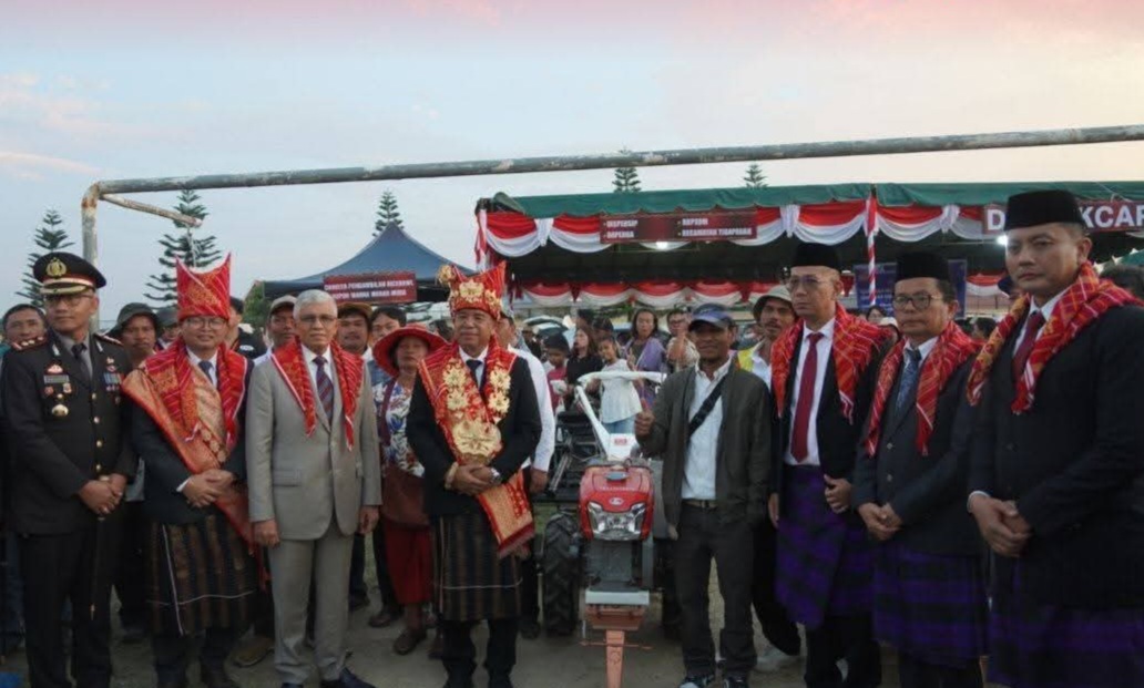 Kabanjahe, Karosatuklik.com – Bupati Karo, Brigjen Pol (Purn) Dr. dr. Antonius Ginting, Sp.OG, M.Kes bersama Forkopimda Karo menyerahkan bantuan alat mesin pertanian (Alsintan) kepada enam kelompok tani binaan di Stadion Samura, Kabanjahe, bertepatan dengan puncak Hari Jadi Kabupaten Karo ke-80, Minggu (8/3/2026) kemarin.