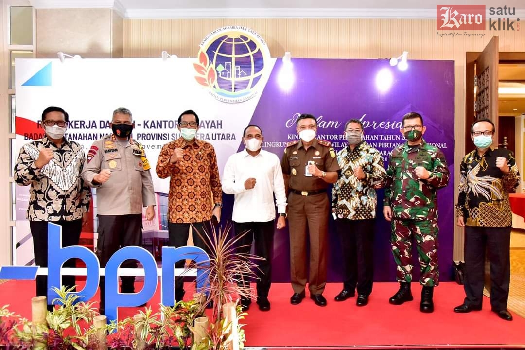 Hal ini disampaikan Edy Rahmayadi saat menghadiri pembukaan Rapat Kerja Daerah (Rakerda) di Lingkungan Kanwil BPN Sumut di Ball Room Adimulia Hotel Medan, Senin (16/11/2020). Saya apresiasi, benar-benar apresiasi, BPN Sumut ikut menyelesaikan urusan pertanahan.