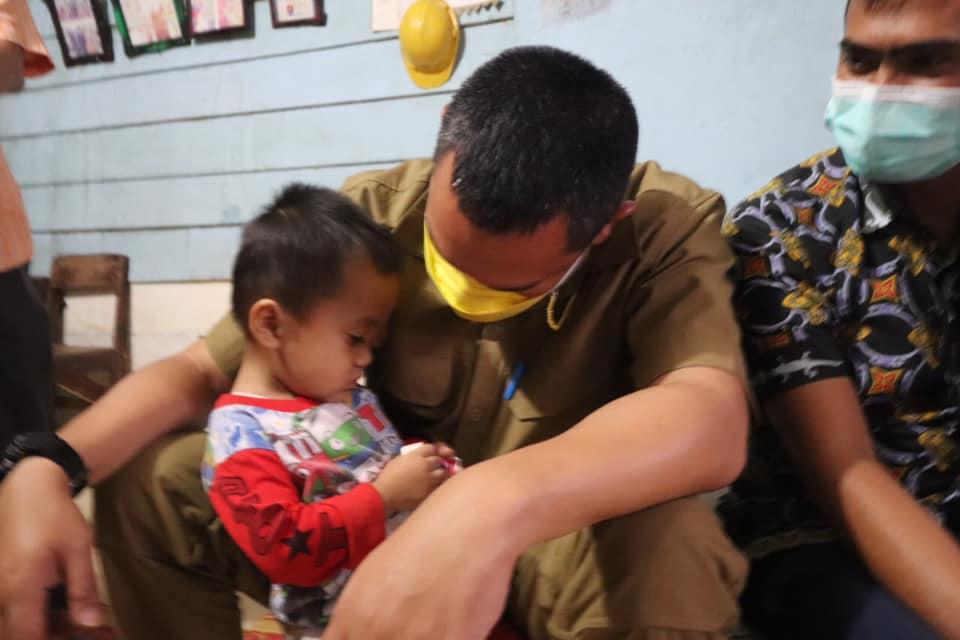 Menunjukkan rasa kasih sayangnya, Bupati Franc Bernhard Tumanggor terlihat memangku sipenderita dan mengajak untuk bermain dengan menayakan sesuatu termasuk berdoa meminta kesembuhan sang anak.