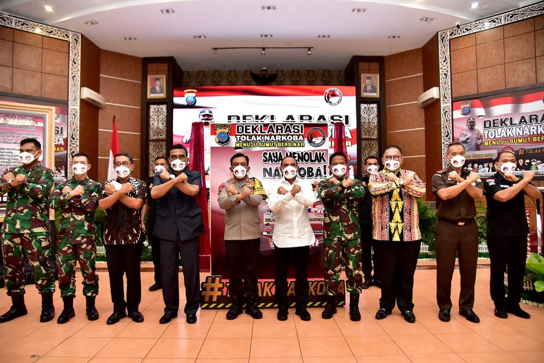 Kapolda Sumut Irjen Pol Panca Putra Simanjuntak, Pangdam I/BB Mayjen TNI Hassanuddin, Ketua DPRD Sumut Drs Baskami Ginting dan unsur Forkopimda lainnya ikut mendeklarasikan Tolak Narkoba dan Pemusnahan barang bukti tersebut, Rabu (14/4/2021).