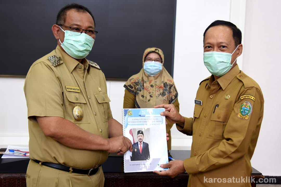 Medan, Karosatuklik.com – Gubernur Sumatera Utara (Sumut) Edy Rahmayadi melalui Sekretaris Daerah Provinsi (Sekdaprov) Sumut R Sabrina melakukan serah terima pelaksanaan tugas dari Penjabat Sementara (Pjs) Bupati/Walikota se-Sumut ke pejabat lama yang menjalani masa cuti kampanye pemilihan kepala daerah (Pilkada) serentak 2020 pada 10 kabupaten/kota, di Rumah Dinas Gubernur, Jalan Jenderal Sudirman Medan, Senin (7/12/2020).