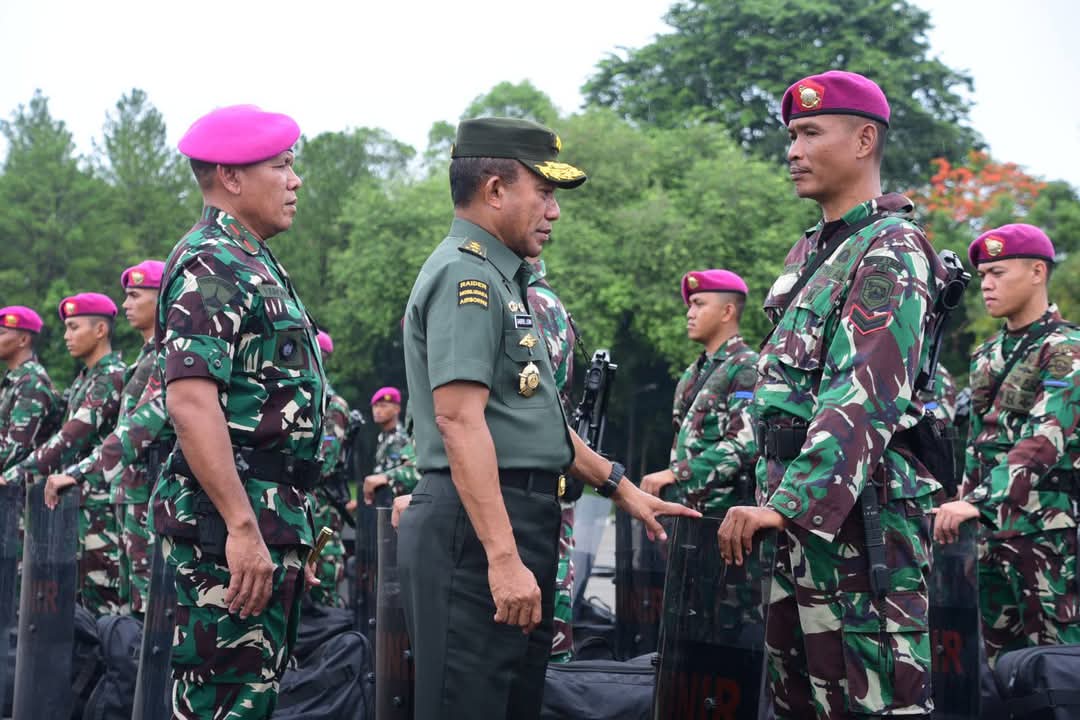 Jakarta, Karosatuklik.com – Dalam rangka memastikan kesiapan pasukan pada pengamanan Natal dan Tahun Baru, Asisten Operasi (Asops) Panglima TNI Mayjen TNI Gabriel Lema, S.Sos, melaksanakan Inspeksi mendadak (Sidak) pengecekan kesiapan prajurit Pasmar 1 Korps Marinir dalam rangka pengamanan peringatan Natal 2024 dan perayaan Tahun Baru 2025 bertempat di Lapangan Apel Brigif 1 Kesatrian Marinir Hartono Cilandak, Jakarta Selatan, Rabu (18/12/2024).