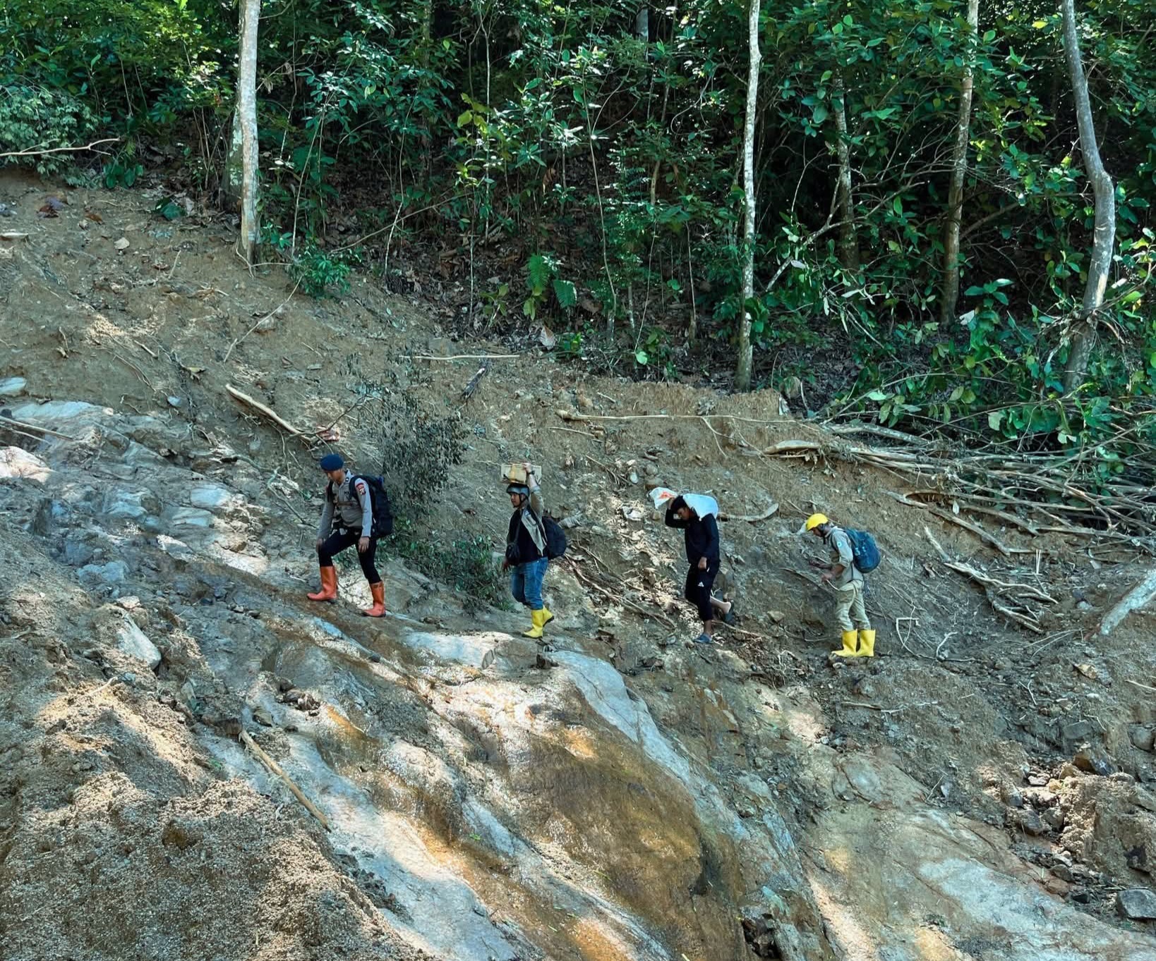 Relawan dan personel Brimob bahu-membahu membawa bantuan melewati jalur ekstrem, bahkan harus memikul sebagian logistik karena kendaraan tidak lagi mampu menembus medan.