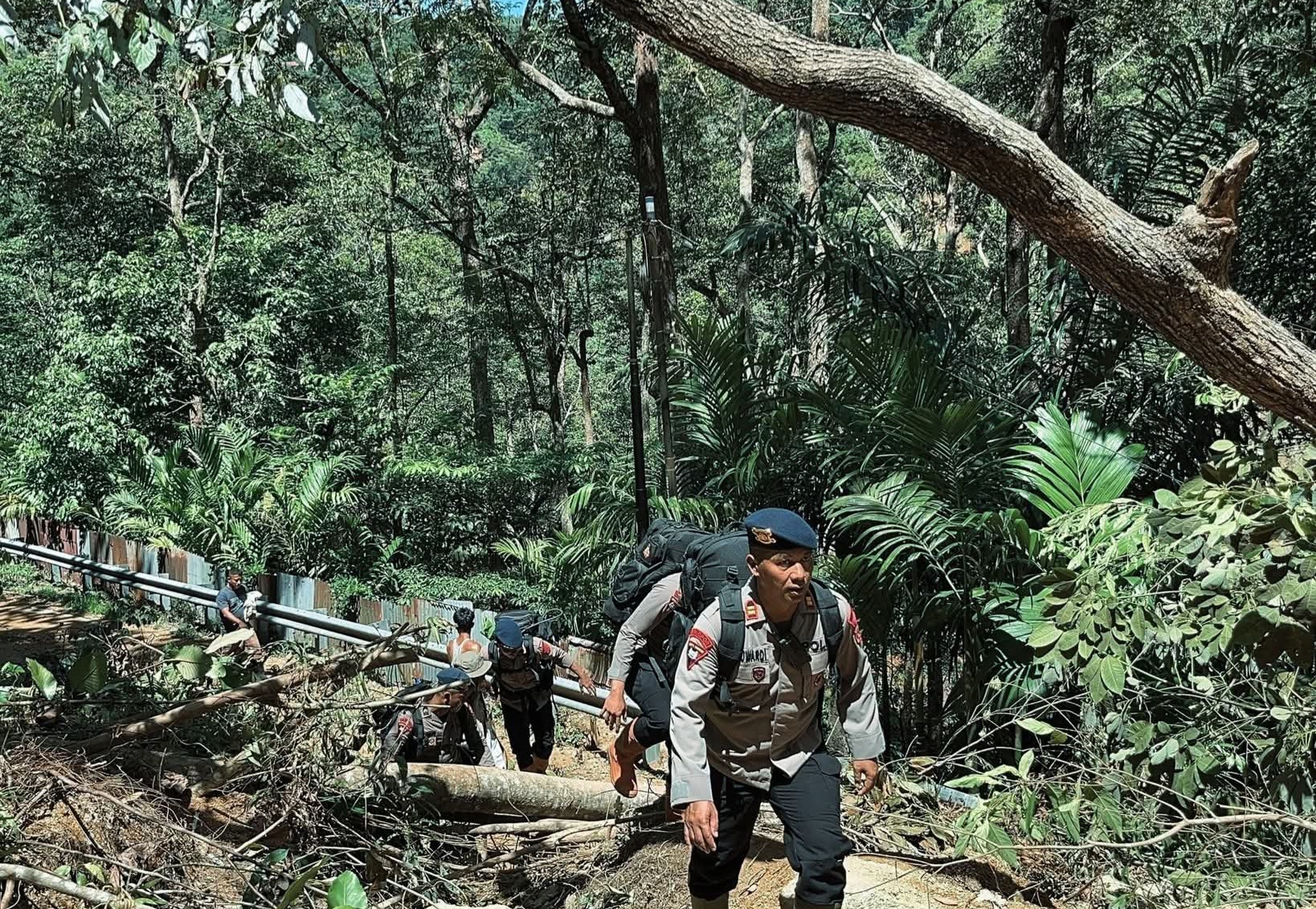 Relawan dan personel Brimob bahu-membahu membawa bantuan melewati jalur ekstrem, bahkan harus memikul sebagian logistik karena kendaraan tidak lagi mampu menembus medan.