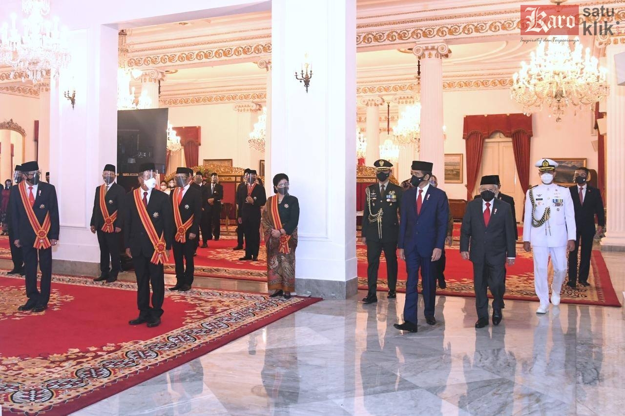 “Kesatu, menganugerahkan tanda kehormatan Bintang Mahaputera dan Bintang Jasa kepada mereka yang nama pangkat, dan jabatannya tersebut dalam lampiran keputusan ini sebagai penghargaan atas jasa-jasanya,” lanjut Basuki.