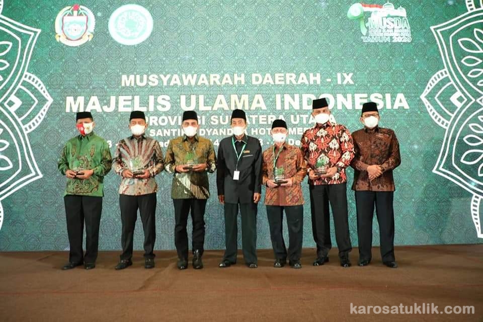 Medan, Karosatuklik.com – Musyawarah Daerah ke – IX tahun 2020 Majelis Ulama Indonesia (MUI) memberikan Award kepada Kapolda Sumatera Utara, Irjen Pol Drs.Martuani Sormin M.Si dan Gubsu Edy Rahmayadi sebagai tokoh peduli MUI di Hotel Santyka Dyandra, Jumat (18/12/2020)