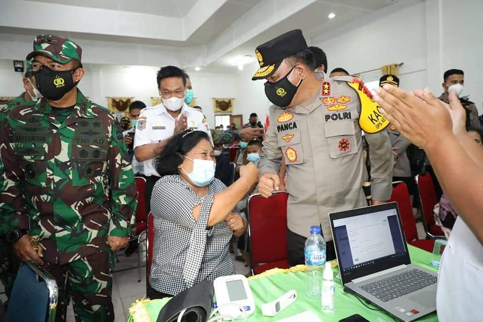 “Tidak sakit divaksinkan bu. Ya, suntikan vaksin ini biar imunitas tubuh kita tetap sehat,” ucap Irjen Pol Panca kepada seorang wanita yang telah menerima suntikan vaksin tersebut.