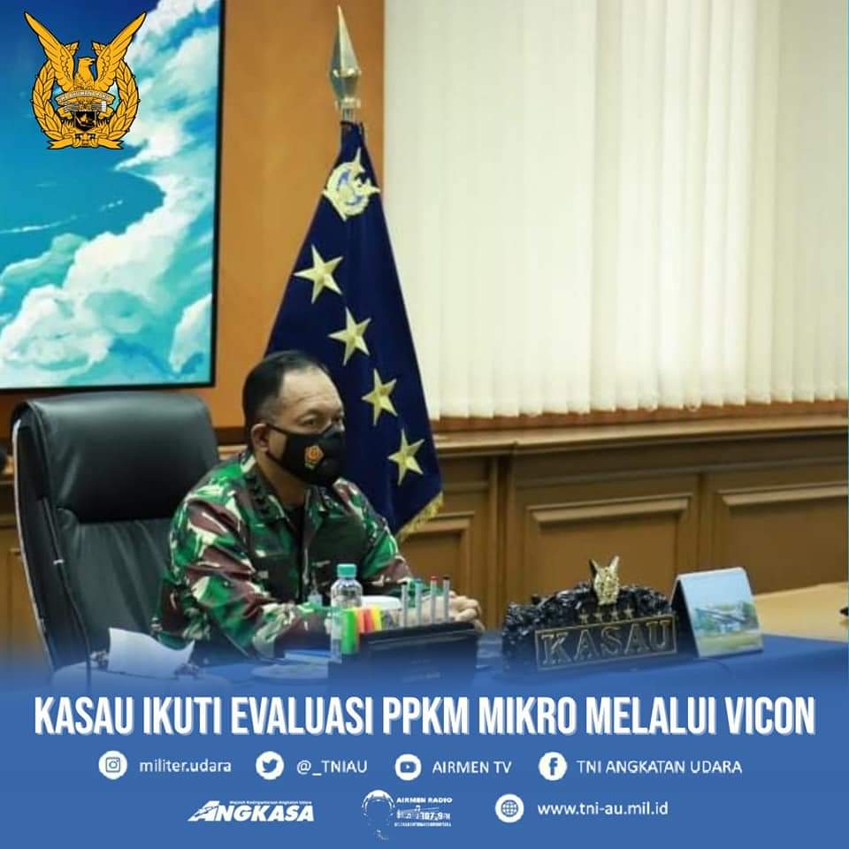 Cilangkap, Karosatuklik.com – Kepala Staf Angkatan Udara Marsekal TNI Fadjar Prasetyo, S.E., M.P.P., mengikuti rapat tentang evaluasi PPKM Mikro yang dipimpin Panglima TNI Marsekal TNI Dr. (H.C.) Hadi Tjahjanto, S.I.P., melalui video telekonferensi (Vicon) dari gedung Raden Suryadi Suryadarma, Mabesau, Senin (21/6/2021), dilansir Karosatuklik.com dari laman Dispen Angkatan Udara (Dispenau)