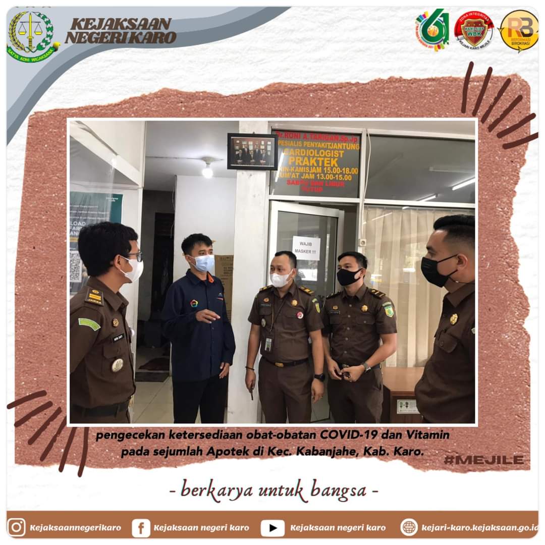 Selama pelaksanaan pemberlakuan pembatasan kegiatan masyarakat (PPKM) Skala Mikro, Kepala Kejari Karo melalui Kasi Intelijen Kejaksaan Negeri Karo yang diwakili Kasubsi B bidang Intelijen, Kasubsi Uheksi Bidang Pidsus, Kasubsi Uheksi Bidang Pidum bersama Jaksa dan Personil Intelijen melakukan pengecekan dan pengawasan ketersediaan obat-obatan COVID-19 serta Vitamin di sejumlah Apotek di Kecamatan Kabanjahe, Kabupaten Karo.