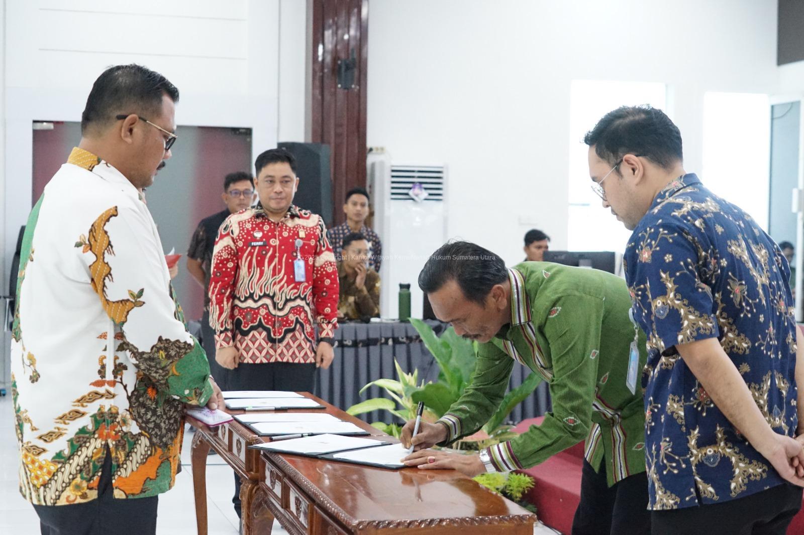 Medan, Karosatuklik.com – Kantor Wilayah Kementerian Hukum (Kemenkum) Sumatera Utara melaksanakan penandatanganan perjanjian pelaksanaan bantuan hukum Tahun Anggaran 2026 sebagai upaya memperkuat akses keadilan bagi masyarakat, khususnya kelompok kurang mampu.