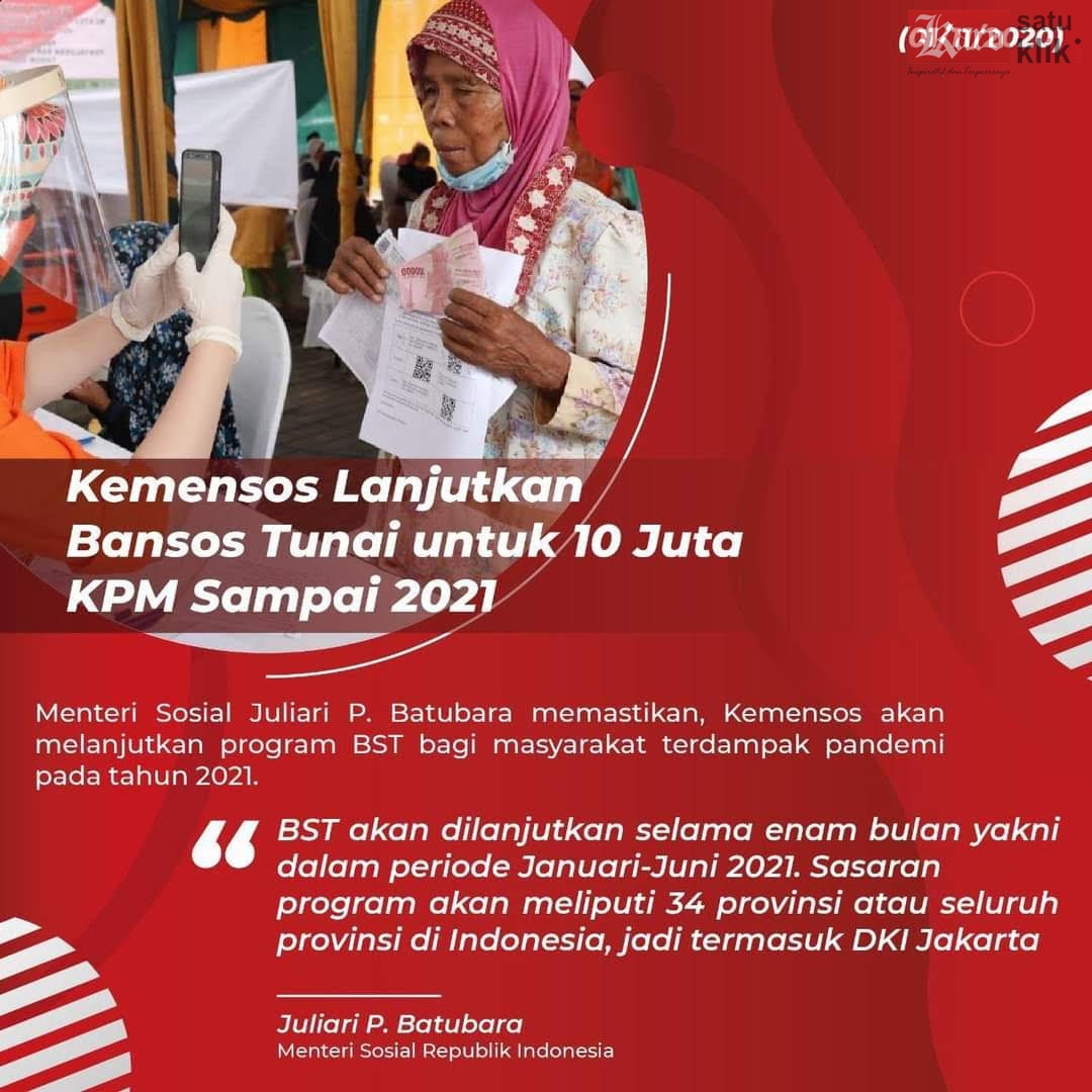 Jakarta, Karosatuklik.com – Pemerintah menilai dampak pandemi Covid-19 belum sepenuhnya mereda pada tahun 2021. Melalui Kementerian Sosial, pemerintah masih akan melanjutkan penyaluran bansos khusus berupa Bansos Tunai (BST) untuk mengurangi beban ekonomi masyarakat terdampak pandemi.