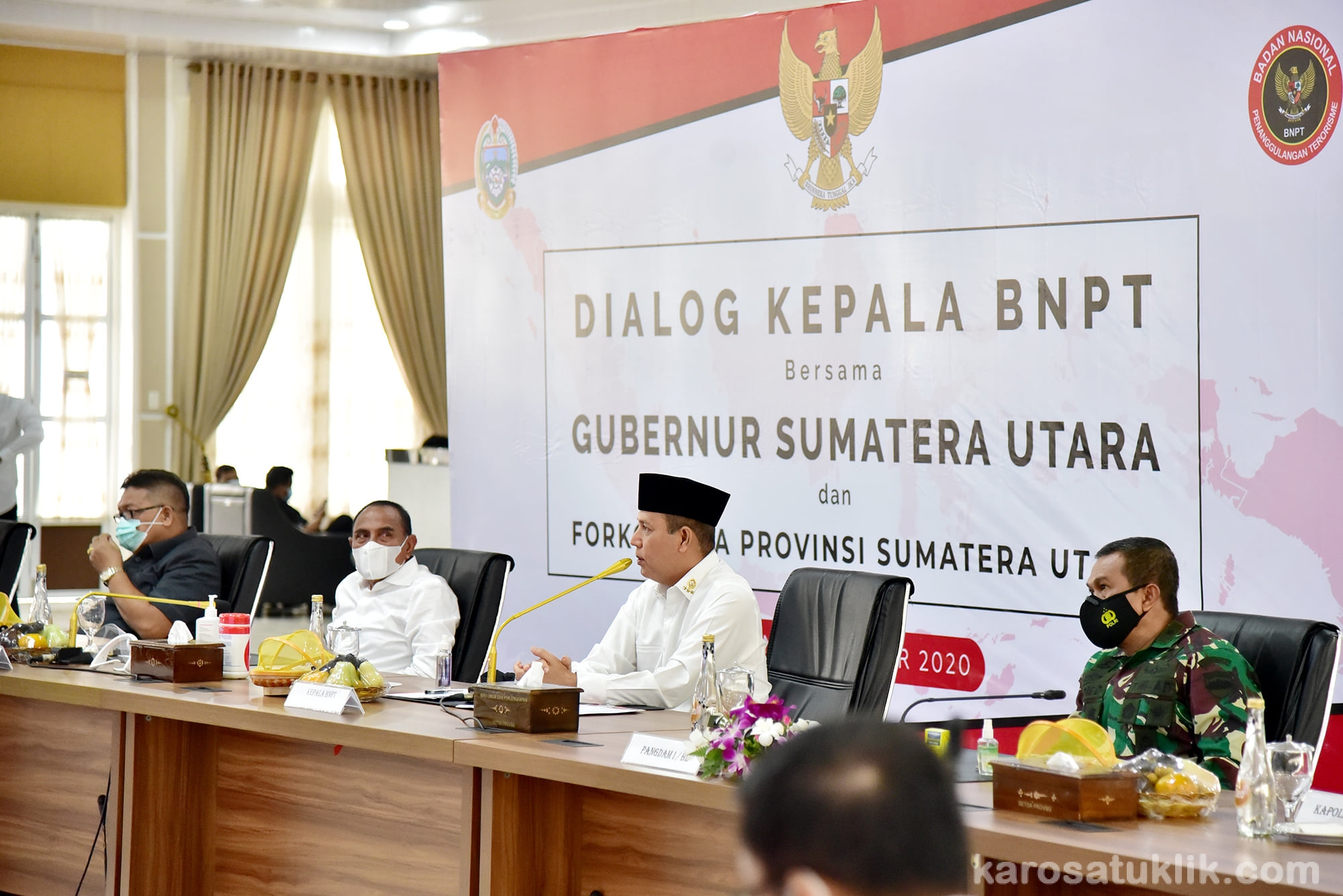 Medan, Karosatuklik.com – Gubernur Sumatera Utara, Edy Rahmayadi berdialog bersama Kepala Badan Nasional Penanggulangan Terorisme (BNPT) Boy Rafli Amar dan Forum Koordinasi Pimpinan Daerah (Forkopimda) Sumut di Pendopo Rumah Dinas Gubernur, Jalan Jenderal Sudirman 41 Medan, Selasa (1/12/2020).