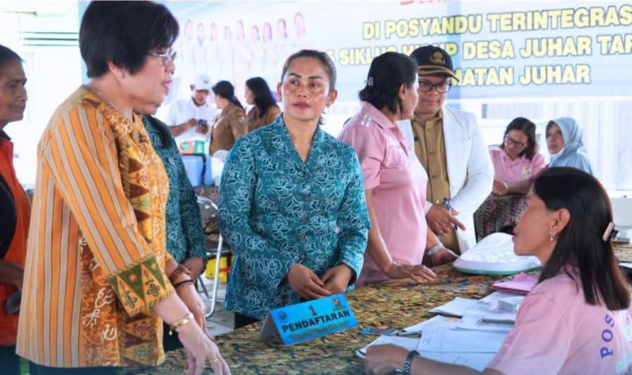 Juhar, Karosatuklik com – Ketua Tim Penggerak Pemberdayaan dan Kesejahteraan Keluarga (TP-PKK) Kabupaten Karo, Ny. Roswitha Antonius Ginting, meninjau kegiatan Lomba Posyandu Desa yang berfokus pada penerapan enam Standar Pelayanan Minimal (SPM) di Desa Juhar Tarigan, Kecamatan Juhar, Selasa (11/11/2025).
