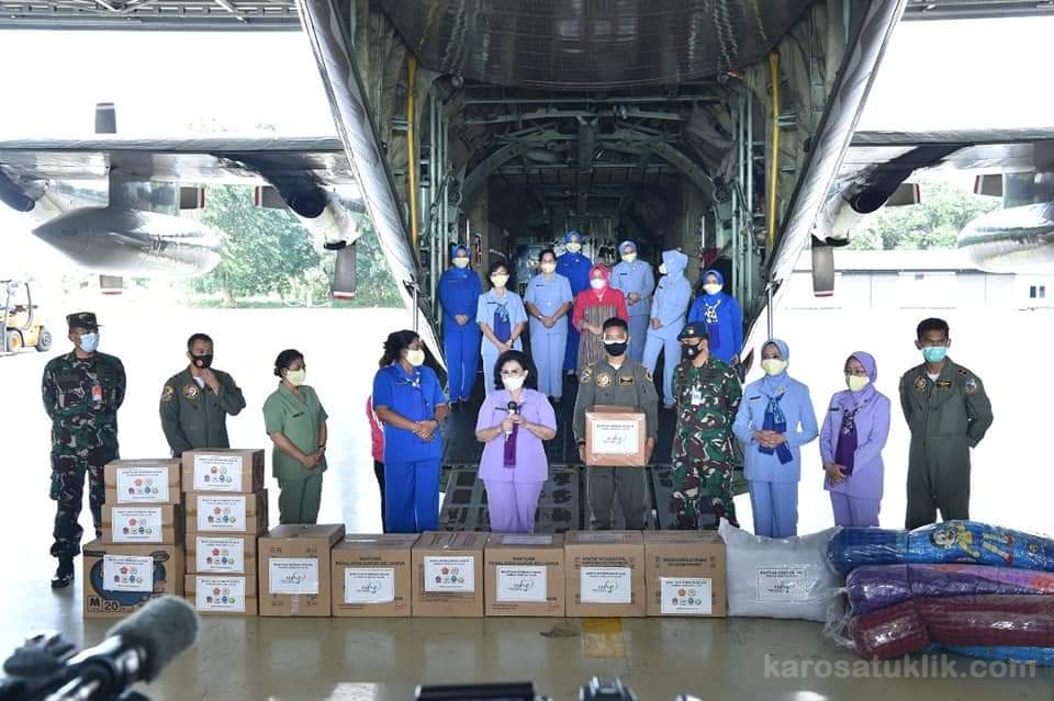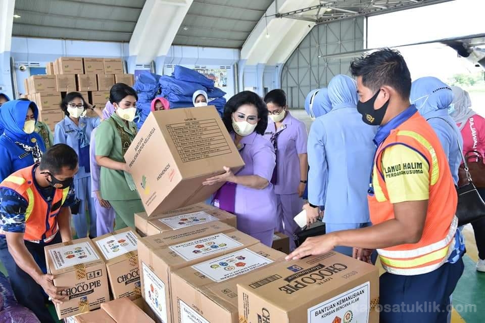 Jakarta, Karosatuklik.com – Ketua Umum Dharma Pertiwi Ny. Nanny Hadi Tjahjanto yang juga bagian dari (Organisasi Aksi Solidaritas Era Kabinet Indonesia Maju) Oase-KIM menyalurkan bantuan untuk korban bencana alam banjir di Kalimantan Selatan dan korban bencana gempa bumi di Sulawesi Barat, bertempat di Lanud Halim Perdana Kusuma Jakarta Timur, Sabtu (16/1/2021).