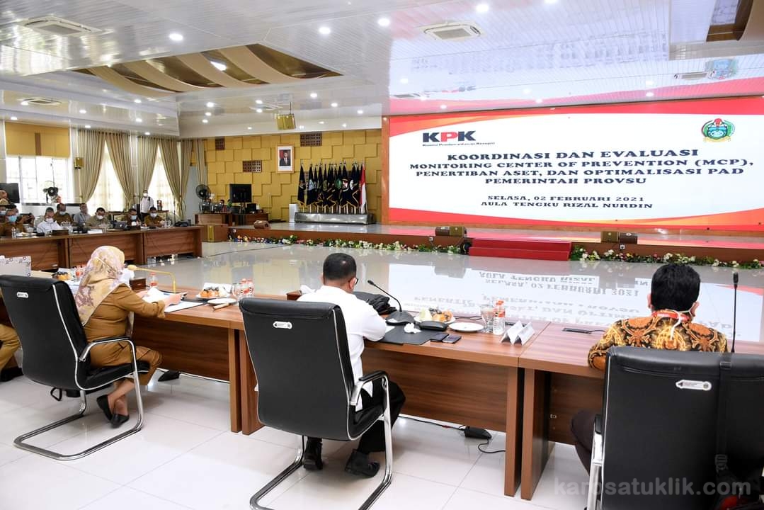 Hal ini disampaikan Sekretaris Daerah Provinsi (Sekdaprov) Sumut R Sabrina dalam Rapat Koordinasi dan Evaluasi Monitoring Center of Prevention (MCP) penertiban aset dan optimilasi PAD Pemprov Sumut bersama Direktur Koordinasi Supervisi I KPK Didik Agung Widjanarko di Aula Tengku Rizal Nurdin, Rumah Dinas Gubernur, Jalan Jenderal Sudirman 41 Medan, Selasa (2/2/2021). Turut hadir sejumlah Pimpinan OPD Provinsi Sumut.