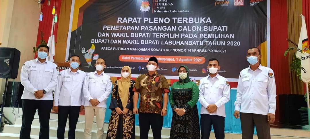 Labuhan Batu, Karosatuklik.com – Pasca keluarnya Putusan Mahkamah Konstitusi (MK) Nomor: 141/PHP.BUP-XIX/2021 sengketa Pilkada Labuhanbatu Tahun 2020 yang dimenangkan Pasangan dr.H. Erik Adtrada Ritonga – Hj. Ellya Rosa Siregar, Komisi Pemilihan Umum (KPU) Kabupaten Labuhanbatu menggelar Rapat Pleno Penetapan Pasangan Calon Bupati dan Wakil Bupati terpilih pada Pilkada Labuhanbatu, Minggu (01/08/2021) di Hotel Permata Land, Rantauprapat.