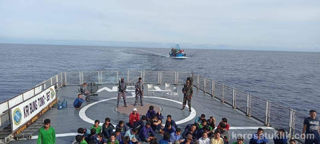 Kepulauan Riau, Karosatuklik.com – KRI Bung Tomo-357 (KRI TOM-357) menangkap Tujuh Kapal Ikan Asing (KIA) berbendera Vietnam yang melakukan aktivitas illegal fishing di Zona Ekonomi Eksklusif (ZEE) Indonesia yaitu di Perairan Natuna Utara, Kepulauan Riau. Minggu (13/12/2020).