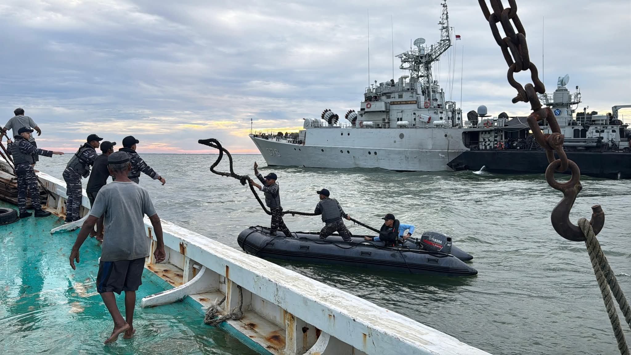 Kateman, Karosatuklik.com – KRI Sultan Thaha Syaifuddin-376 (KRI STS-376) yang berada berhasil mengevakuasi kapal kargo kayu KM Berkat Nikmat Ilahi yang mengalami kerusakan mesin dan terombang-ambing selama dua hari di timur laut Pulau Kateman, Rabu (6/8/2025).