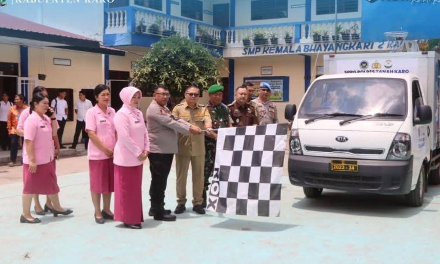 Kabanjahe, Karosatuklik com – Wakil Bupati Karo, Komando Tarigan,SP, melaunching program Makan Bergizi Gratis (MBG) di SMP Kemala Bhayangkari 2 Kabanjahe, Senin (22/09/2025).