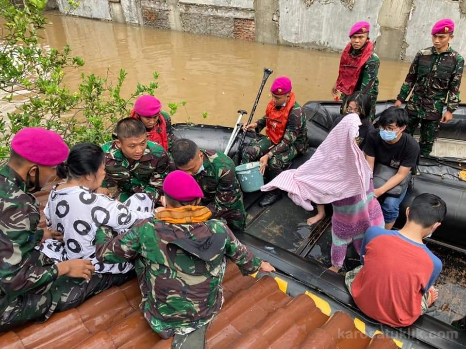 Jakarta, Karosatuklik.com – Tidak menunggu waktu lama, Satuan Tugas (Satgas) Penanggulangan dan Penanganan Bencana Banjir, Prajurit Pasukan Marinir(Pasmar) 1 mengevakuasi warga Kemang Ibu Chaerani Pramono yang sakit dan terjebak banjir di daerah Kemang Selatan, Sabtu (20/02/2021).