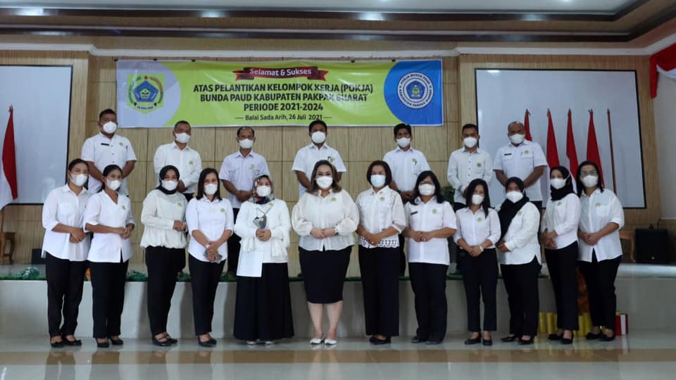 Salak, Karosatuklik.com – Bupati Pakpak Bharat Franc Bernhard Tumanggor melantik Kelompok Kerja (POKJA) Bunda PAUD (Pendidikan Anak Usia Dini) Kabupaten Pakpak Bharat di Gedung Balai Sada Arih, Senin (26/7/2021).